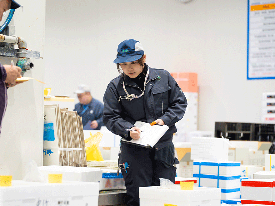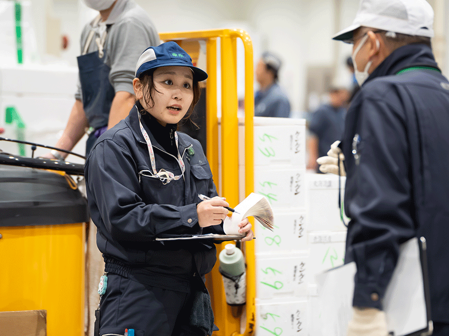 お客様からの注文内容を整理し、翌朝の荷揚げ(荷下ろしと仕分け)担当者に共有します。また、上司が担当するセリの準備をサポートし、伝票作成などの付随作業も行います。 -